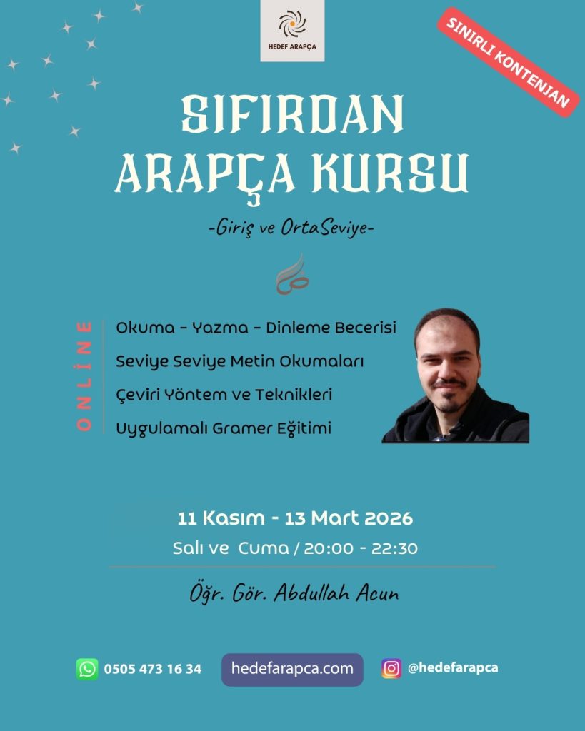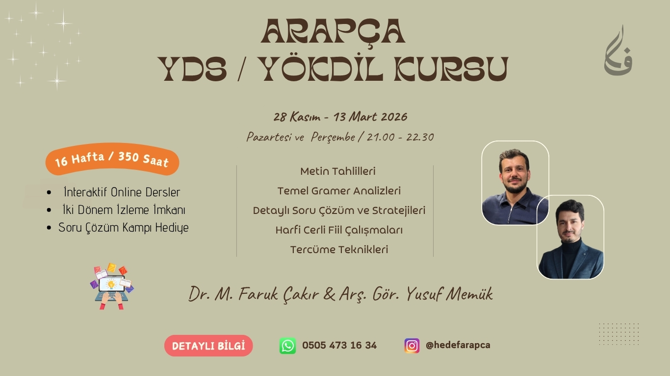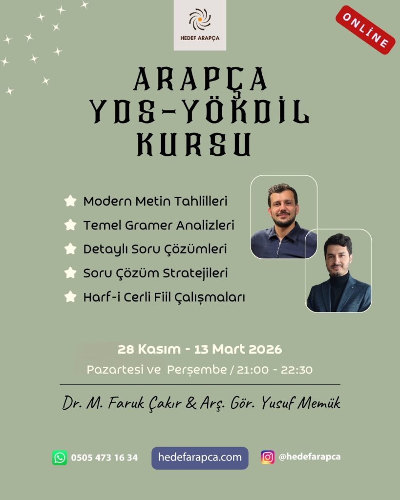 Hocam sınavda Türkçe-Arapça, Arapça-Türkçe çeviriler de okuduğumuz modern metinlerden ezberlediğimiz kelimeler çok fazla vardı işimi baya kolaylaştırdı☺ Ayrıca sınavda Fiil-Harfi Cerr sorularında da ezberlettiğiniz kelimeler kulaklarım da çınladı ve Soru çözümünü oldukça kolaylaştırdı 😊 İlk etapta tereddütle başladığım kursta sayenizde kelime ezberimi artırarak baya ilerleme kaydettim 😊 Ders konusunda gösterdiğiniz ilgi ve destek için Allah razı olsun hocam ☺